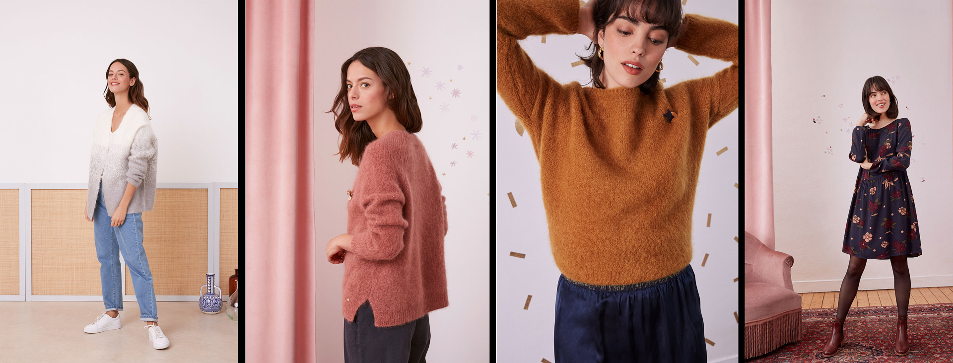 Des Petits Hauts, deux créatrices parisienne, deux sœurs passionnées de mode, Katia et Vanessa Sanchez – comme son nom l’indique, c’est plein de petits hauts, sous toutes les formes. Un côté poétique, bucolique et bohème chic. De jolies matières naturelles (mohair, cashmere, coton…) ultras douces avec un souci du détail
